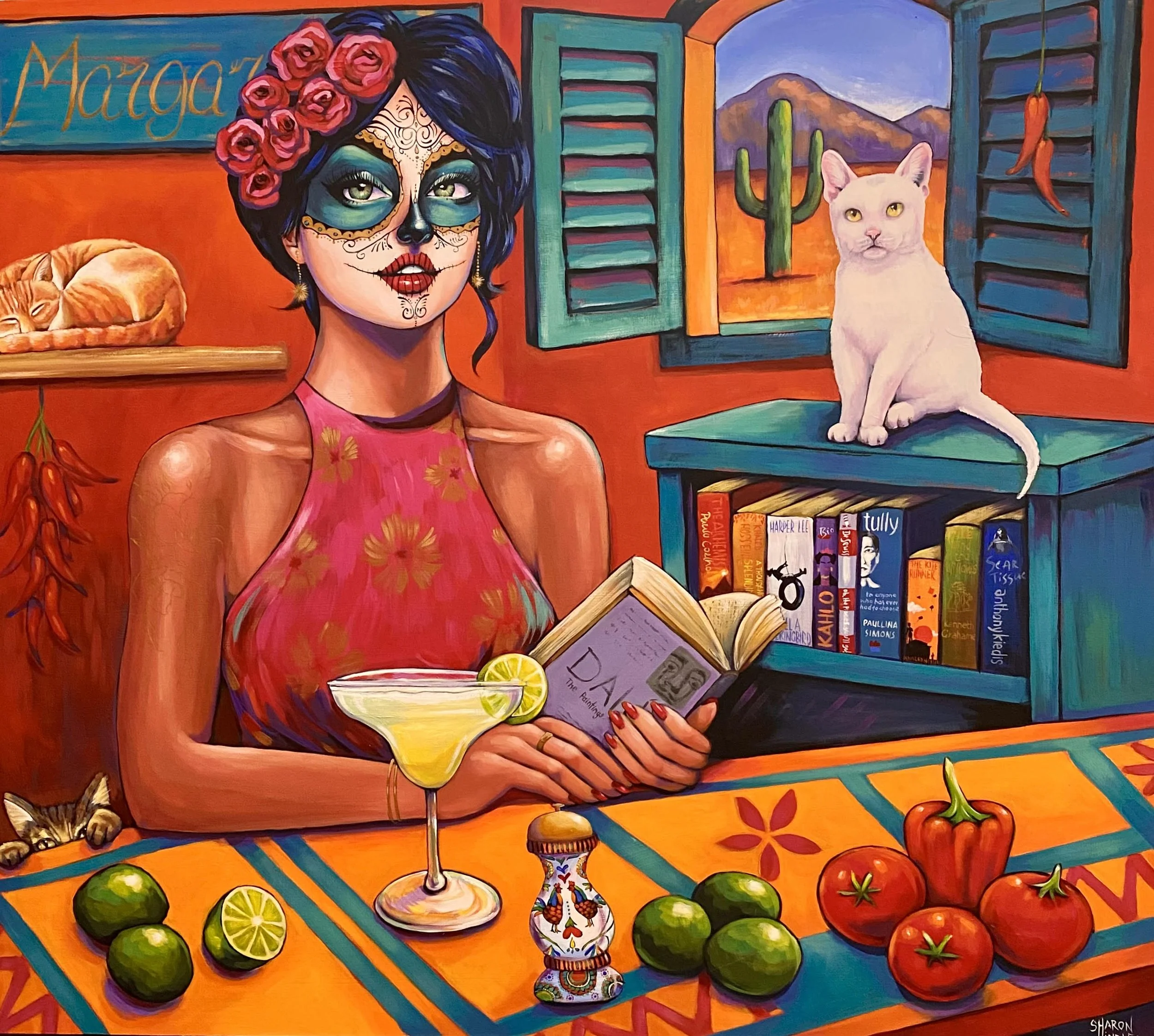Whether she’s painting a sugar skull, kangaroo or guiding students through their first brushstrokes, Sharon continues to inspire with her fearless use of colour, her love for storytelling, and her unwavering dedication to the arts.